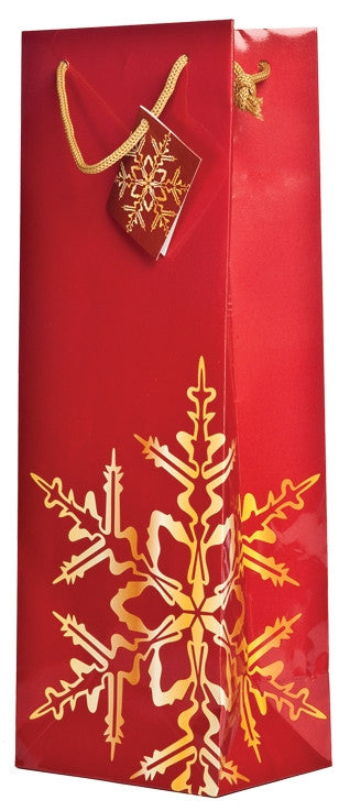 Let it snow! Let it snow! Let it snow! The snowflake Paper Holiday Wine Bag full color glossy bag is made of glossy stock with a reinforced cardstock bottom for toting a standard bottle wine wherever you're bringing it as a gift. The fabric cord handles make it easy to carry and the attached, matching card makes it simple to sign, insert, and go. The bag is 14 3/16" tall and 4 7/8" wide.